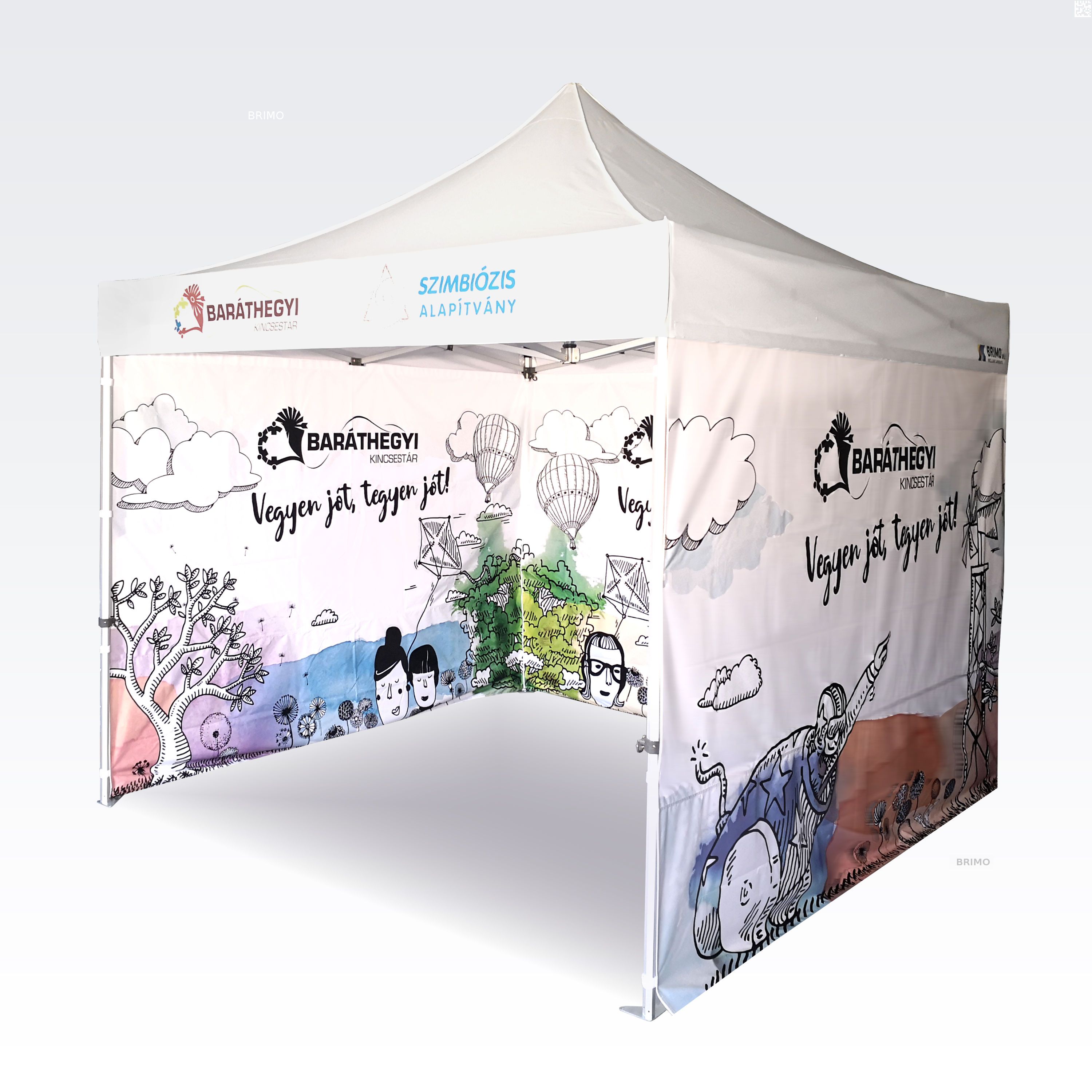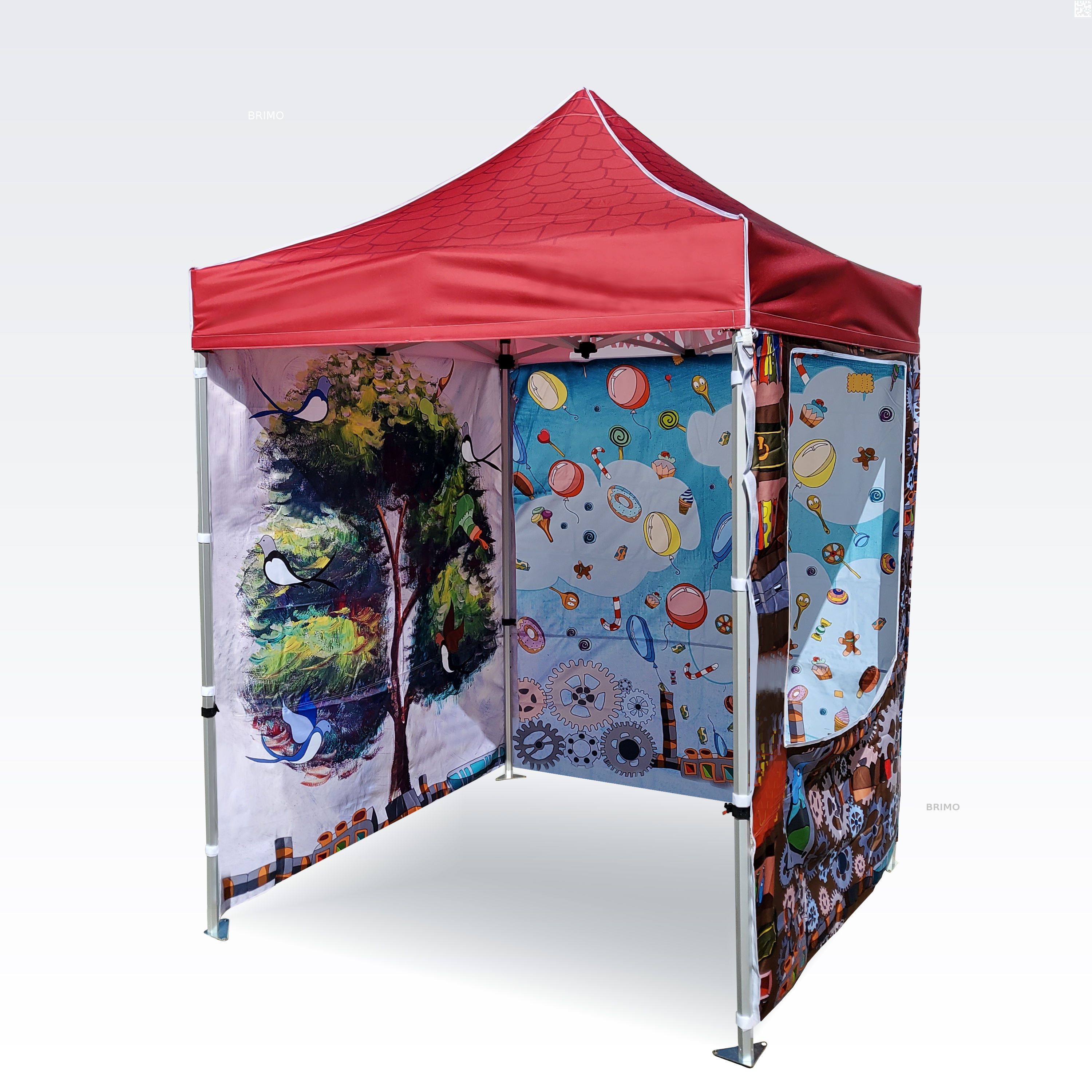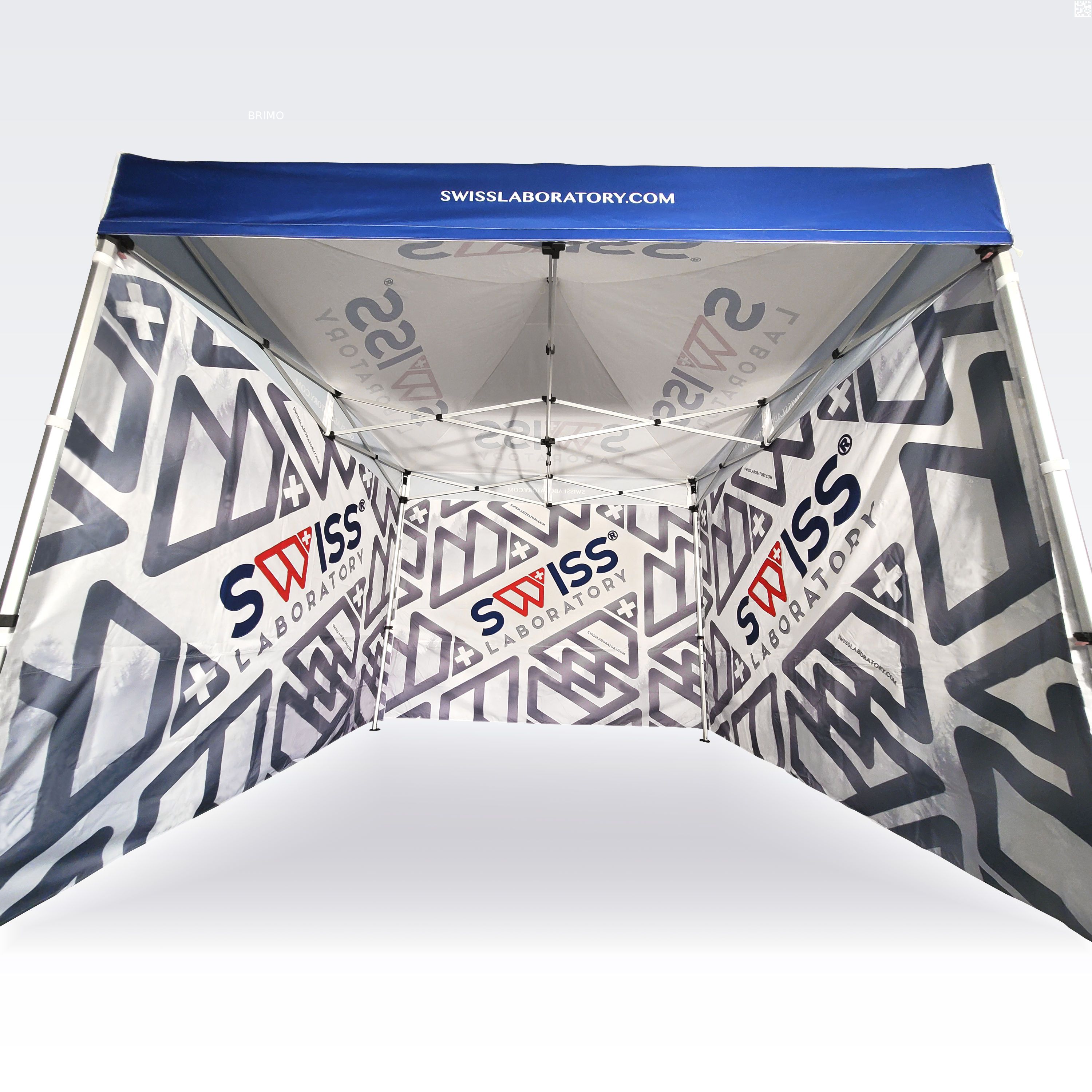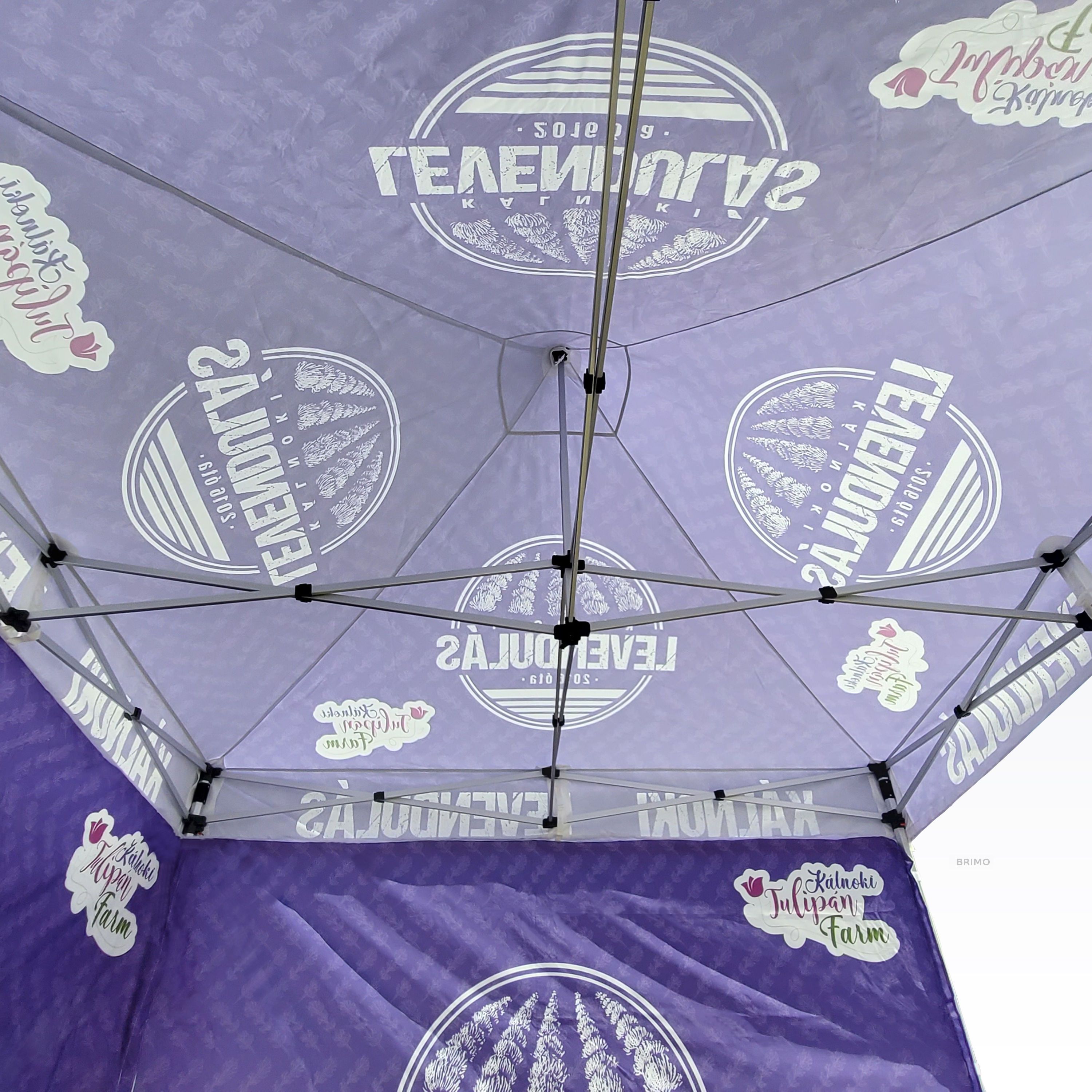 Promotietenten met digitale sublimatiedruk. De opdruk ontstaat door een chemisch proces waarbij de inkt onder hoge temperatuur direct in de structuur van de stof doordringt. Logo, tekst of elk type grafisch ontwerp op de binnen- of buitenkant van de tent, volledig aangepast aan de wensen van de klant.
