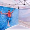 Promotietenten met digitale sublimatiedruk. De opdruk ontstaat door een chemisch proces waarbij de inkt onder hoge temperatuur direct in de structuur van de stof doordringt. Logo, tekst of elk type grafisch ontwerp op de binnen- of buitenkant van de tent, volledig aangepast aan de wensen van de klant.