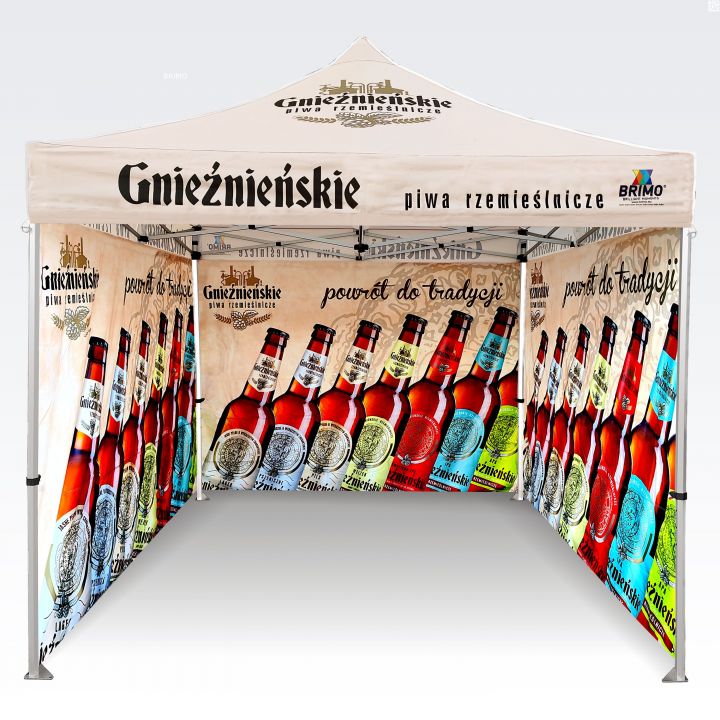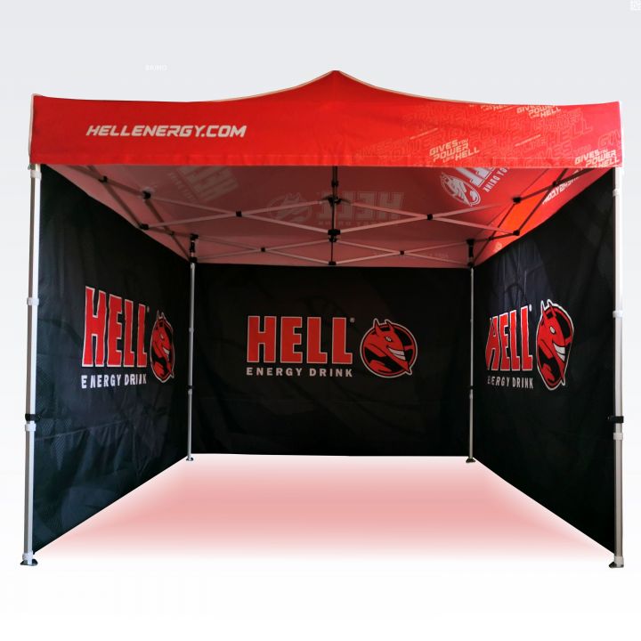 Promotietenten met digitale sublimatiedruk. De opdruk ontstaat door een chemisch proces waarbij de inkt onder hoge temperatuur direct in de structuur van de stof doordringt. Logo, tekst of elk type grafisch ontwerp op de binnen- of buitenkant van de tent, volledig aangepast aan de wensen van de klant.