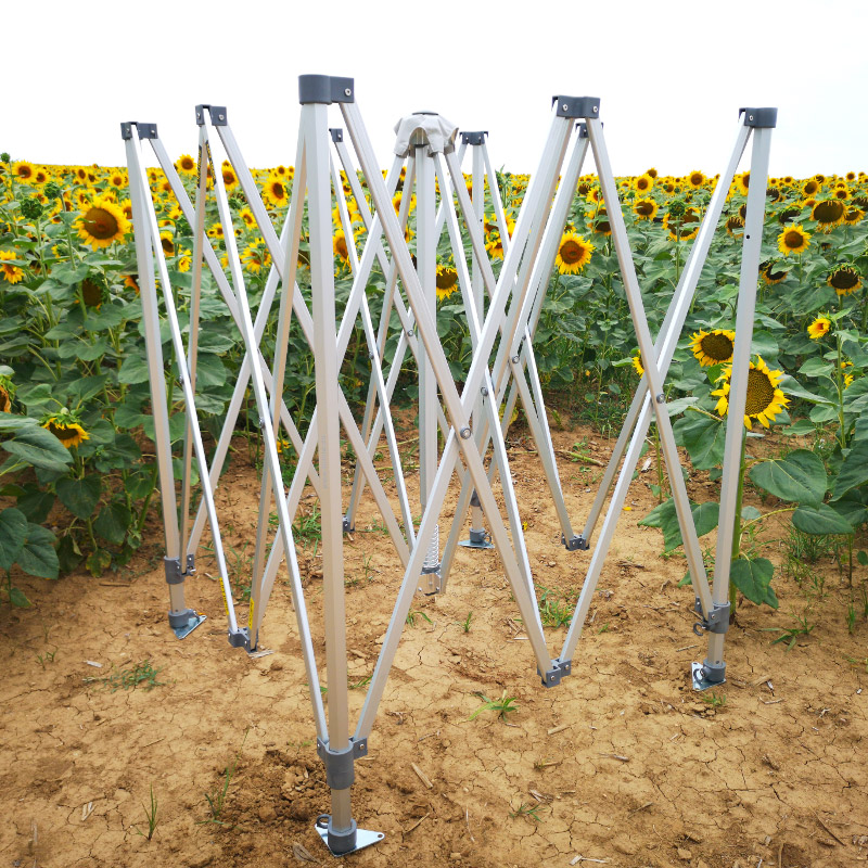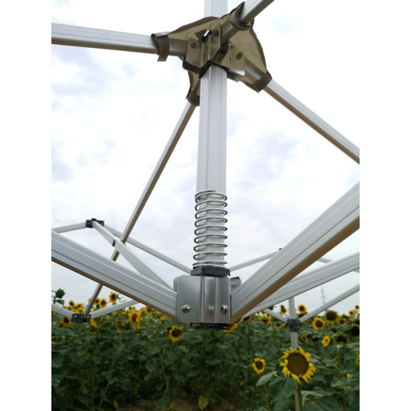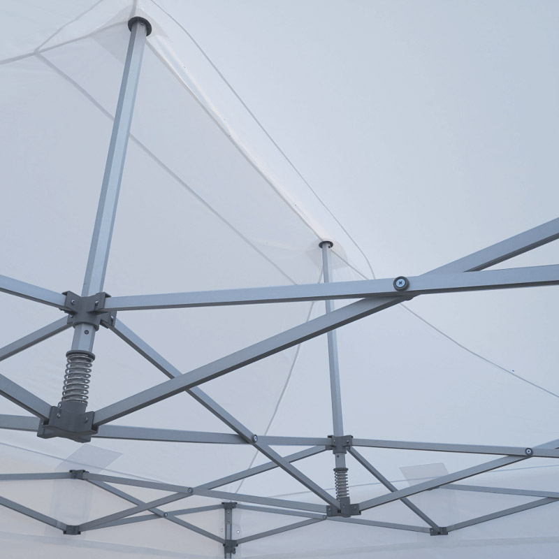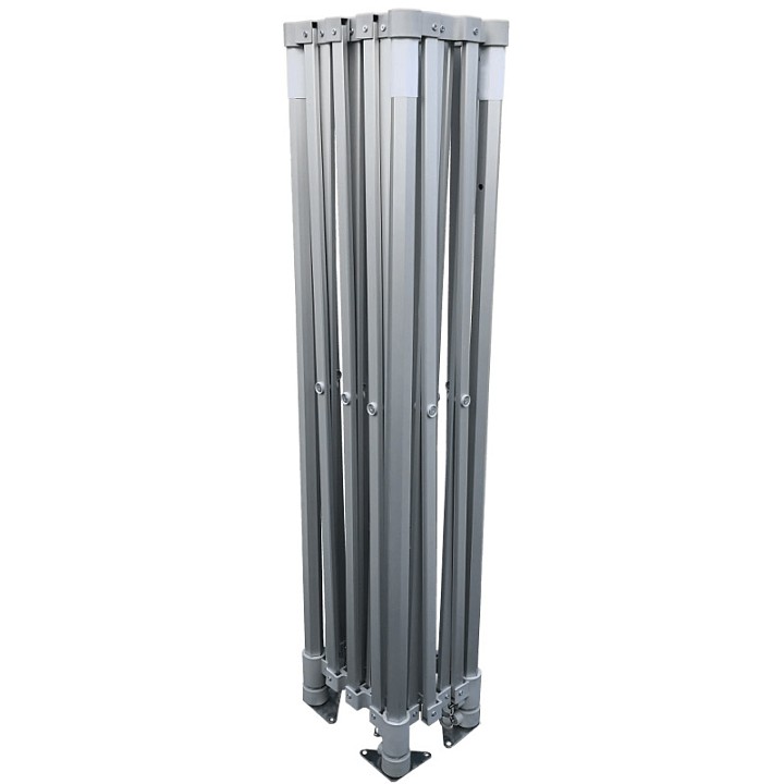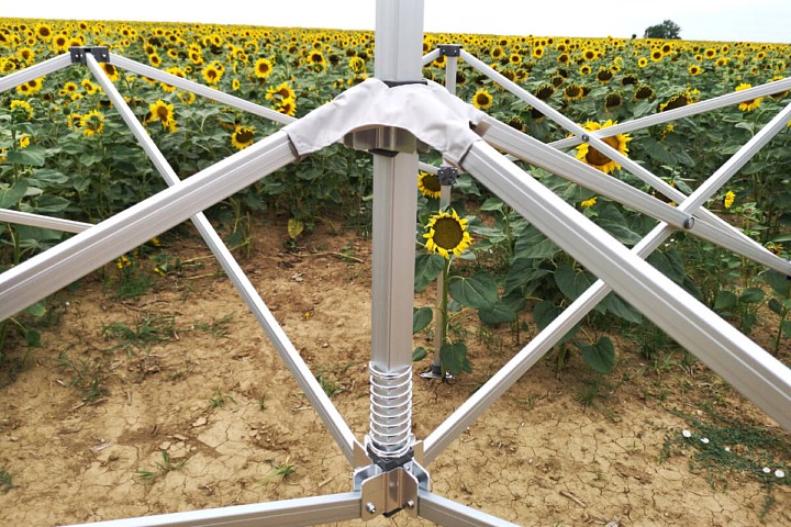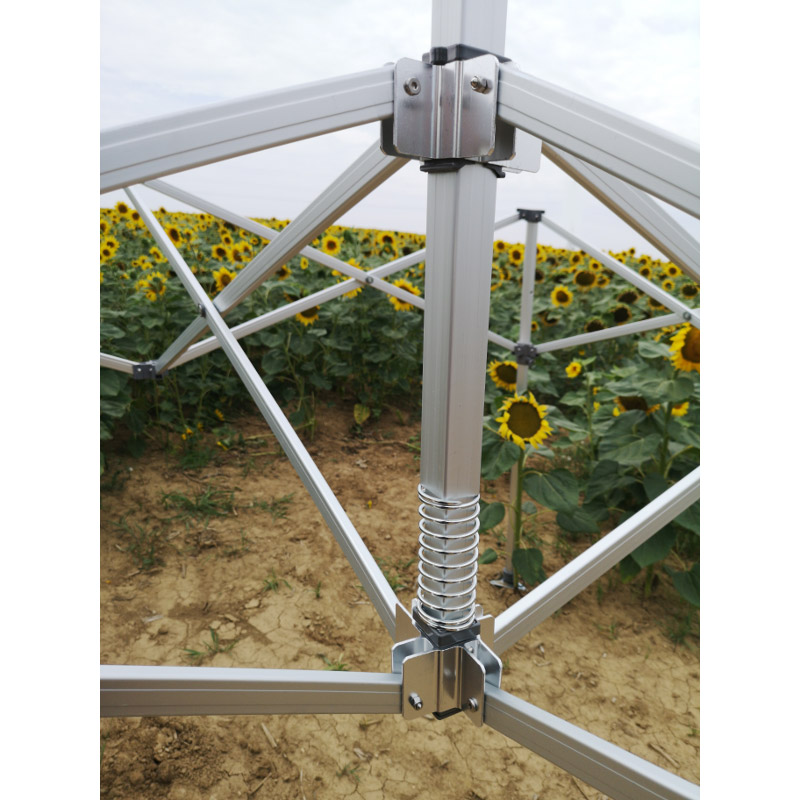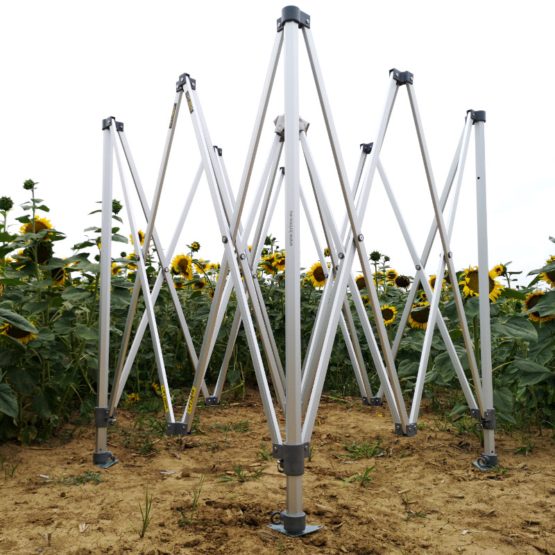 - Massieve zeshoekige poten (45 mm): Topdiameter en profiel van de poten in combinatie met 1,8 mm dikke aluminium wanden zorgen voor uitstekende stabiliteit en een onverzettelijke stand van het paviljoen op elk evenemententerrein.